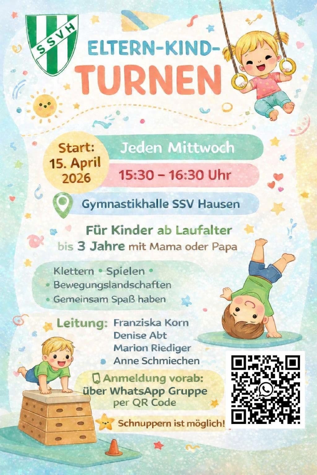 Wir freuen uns, ab 15. April wieder Eltern-Kind-Turnen anbieten zu können. Das Turnen wird von Franzisa Korn, Denise Abt, Marion Riediger und Anne Schmiechen geleitet.